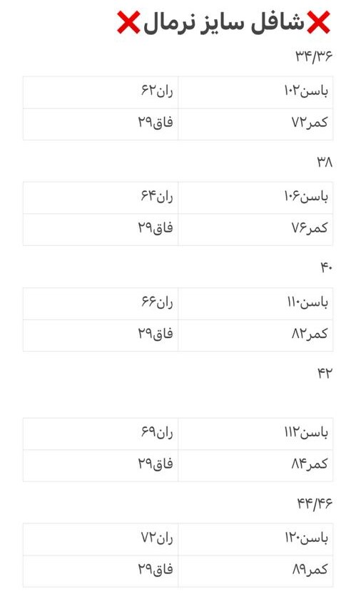 | ۹۴ سانت | ۷۰ الی ۷۲ سانت | ۳۴/۳۶ |