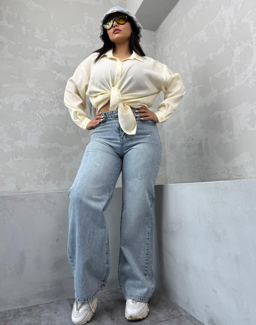 شلوار نیم بگ سایز بزرگ آبی برفکی کد 3251