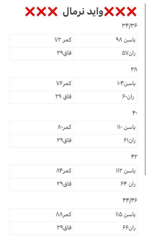 | ۹۴ سانت | ۷۰ الی ۷۲ سانت | ۳۴/۳۶ |