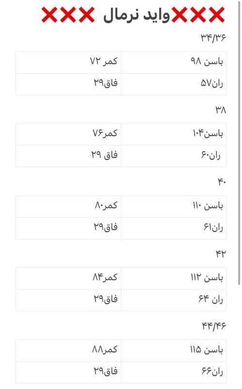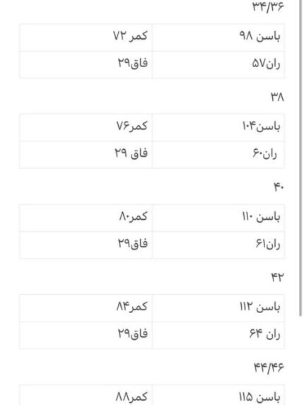 | ۹۴ سانت | ۷۰ الی ۷۲ سانت | ۳۴/۳۶ |